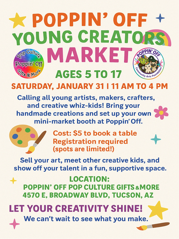 The mission of the Poppin' Off Community Arts Foundation is to promote, support, and expand access to arts, culture, and community creativity. We do this by providing events, programs, and resources that foster inclusion, collaboration, and artistic self-expression.